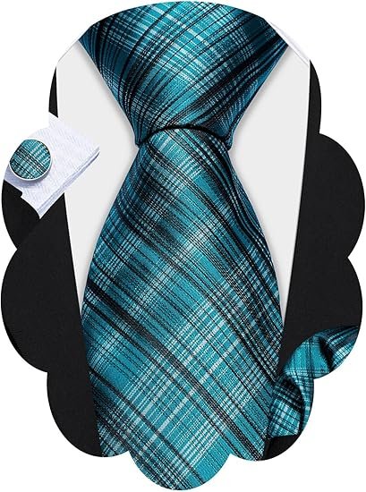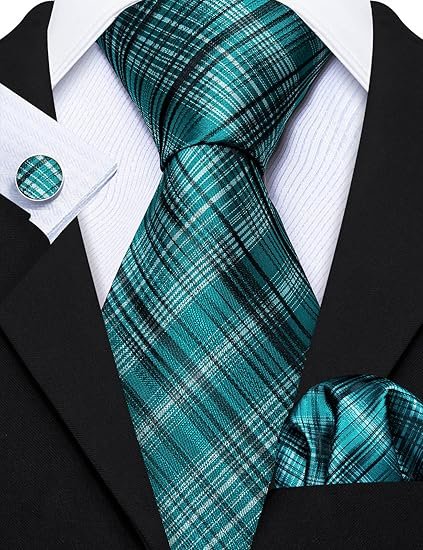 Designer Classic Ties for Men Set Formal Pocket Square Cufflink Check Plaid(A Teal)