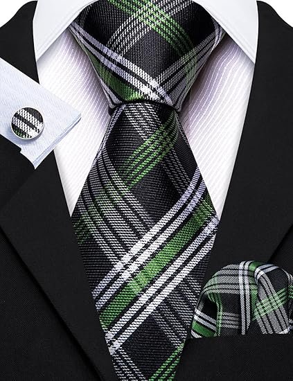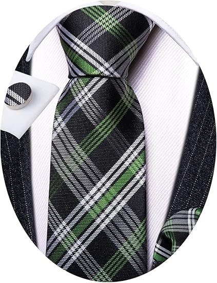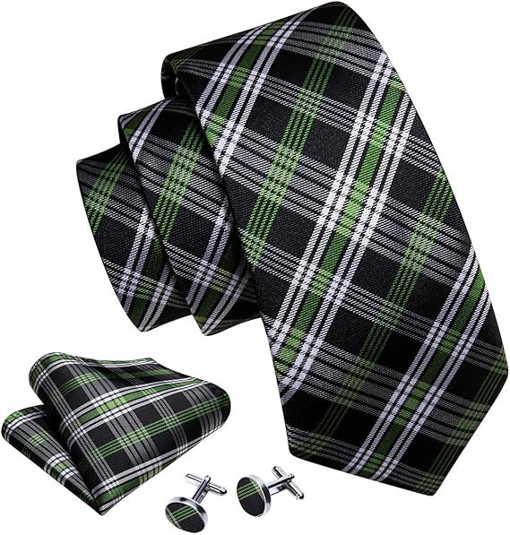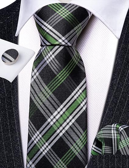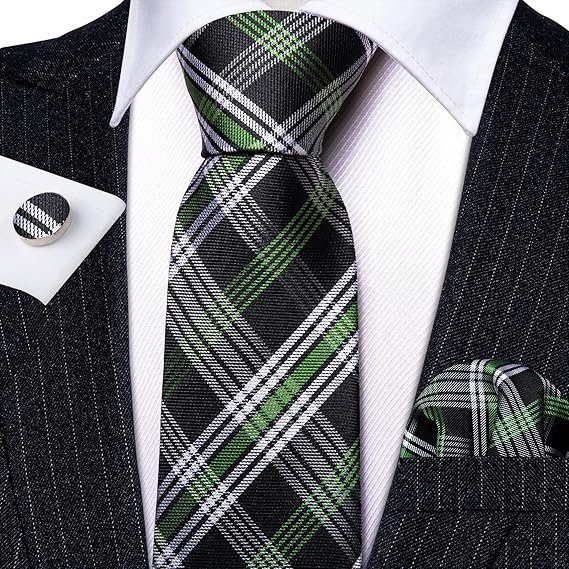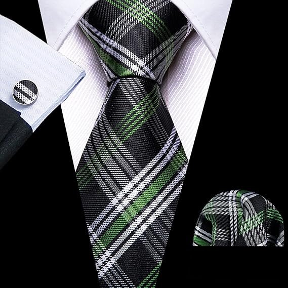 Designer Classic Ties for Men Set Formal Pocket Square Cufflink Check Plaid(Black Green)