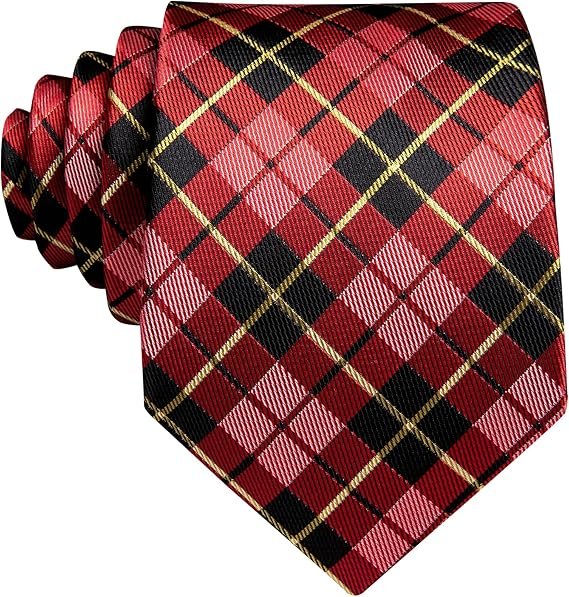 Designer Classic Ties for Men Set Formal Pocket Square Cufflink Check Plaid(Blood Red Black)