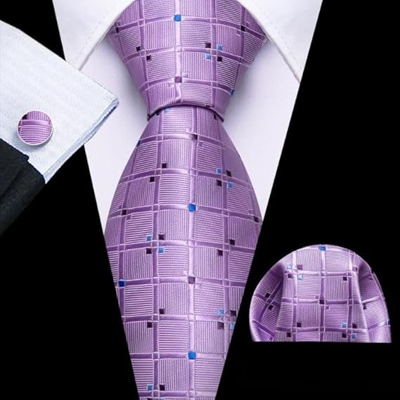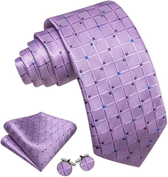 Designer Classic Ties for Men Set Formal Pocket Square Cufflink Check Plaid(Purple Plaid)