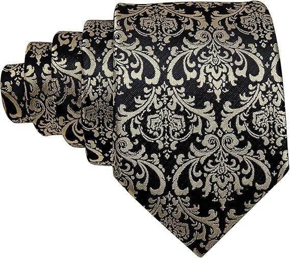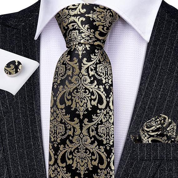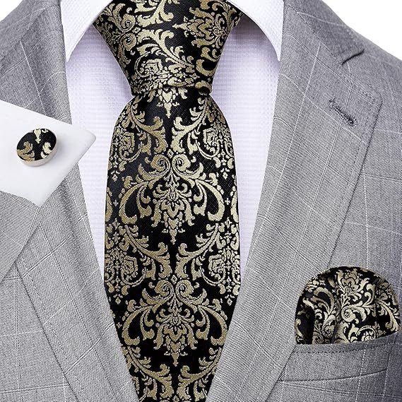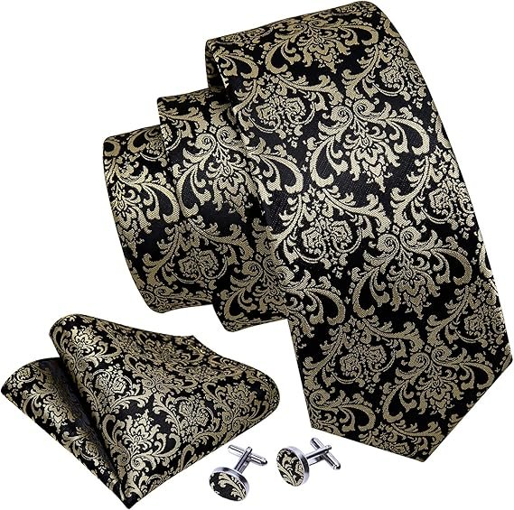 Paisley Tie Fashion Set Hanky Cufflinks Neckties for Men Woven Silk(Black Gloden)